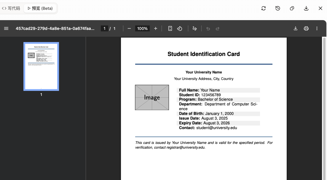 帮我生成一份英文的学生证的word模板,A5大小,要求信息齐全,用于给GitHub Education认证。